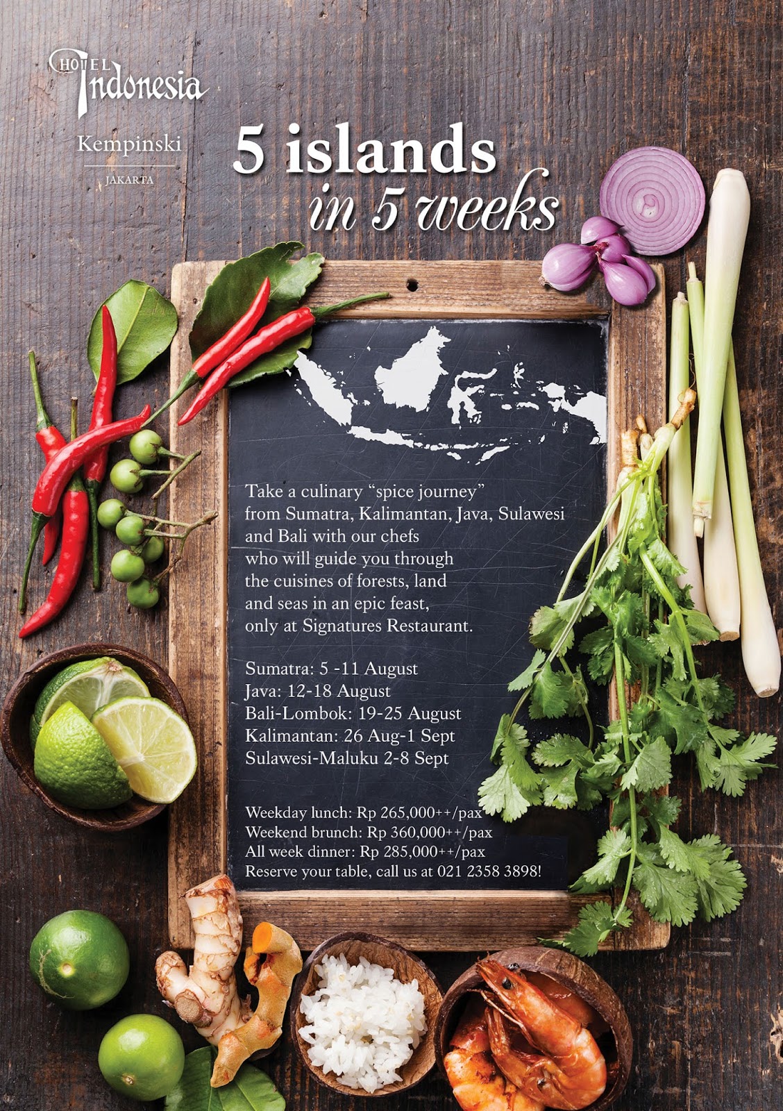 Bertepatan dengan perayaan hari kemerdekaan RI ke – 70 yang sekaligus bersamaan dengan perayaan ulang tahun ke – 53, Hotel Indonesia Kempinski menyelenggarakan event kuliner “Spice Journey, 5 Island in 5 Weeks”. Yang bertempat di salah satu restorannya yaitu “Signature Restaurant” yang terletak di lobby antara Ganesha dan Ramayana wings.