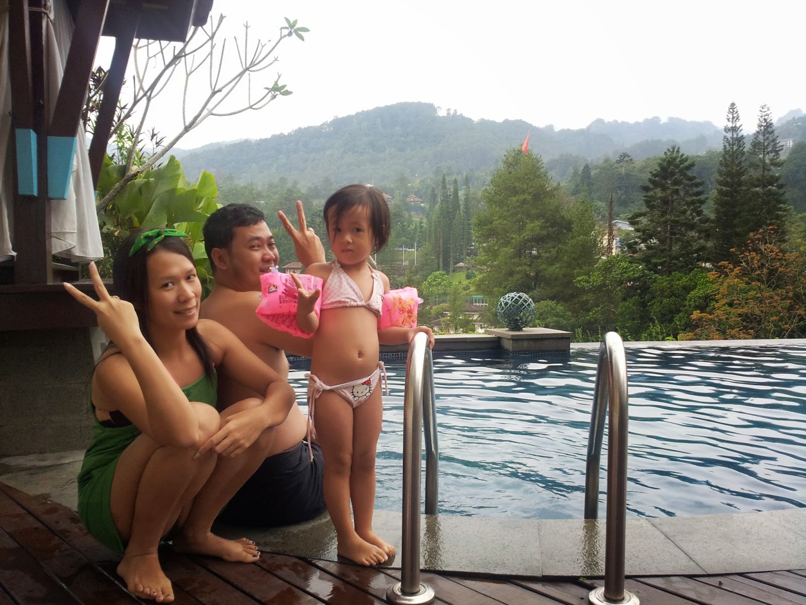 Muka – muka cape tapi happy yang terbayar dengan view mountain Gunung Salak disebelah kiri dan view kolam renang di sebelah kanan.