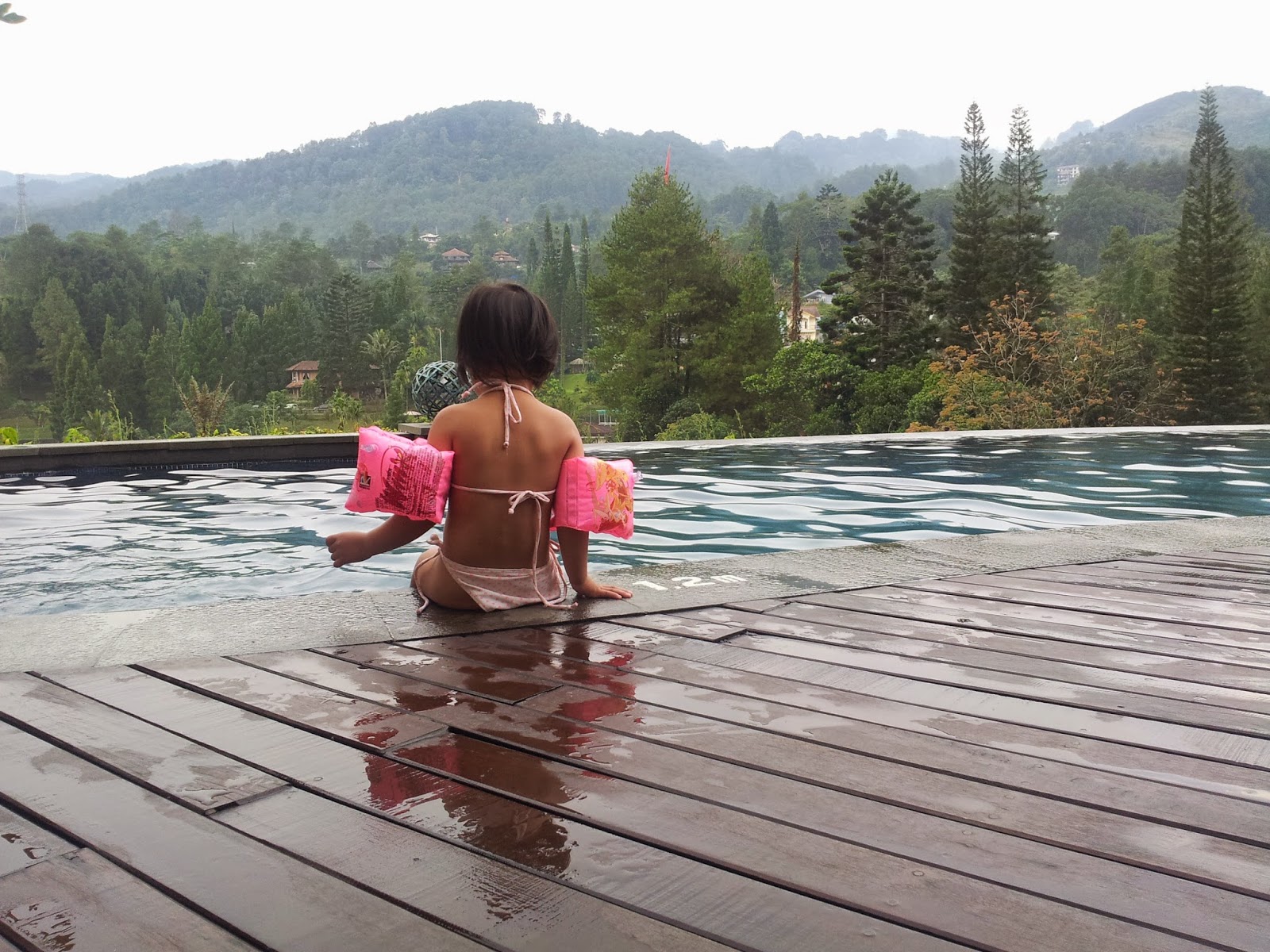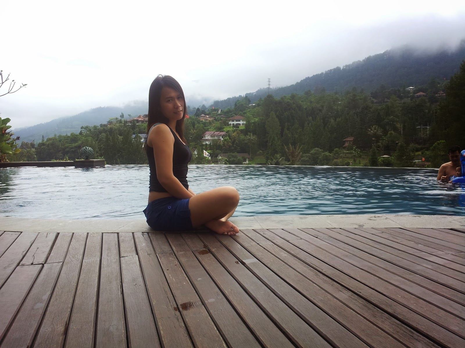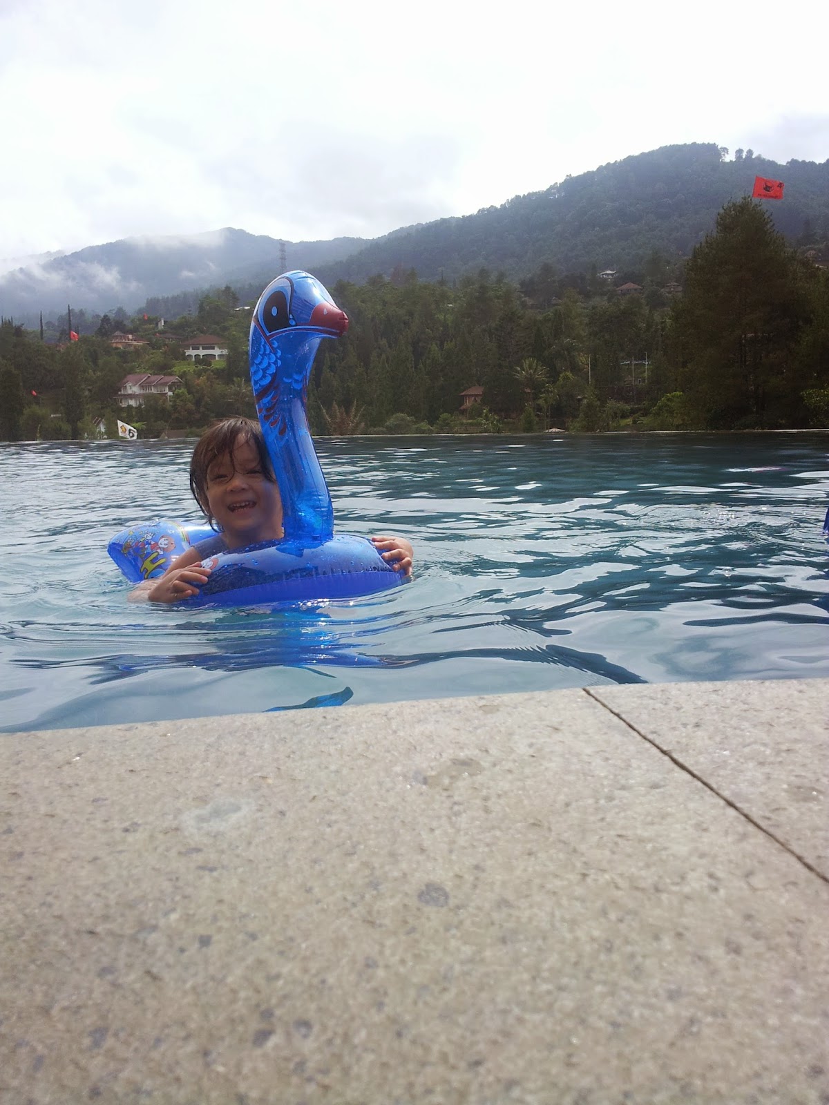 Kemudian kita pergi ke kolam renang yang terletak satu lantai dengan lobby. Meskipun airnya dingin karena cuaca yang rada mendung tidak mengurungkan niat untuk berenang. Let’s swim!