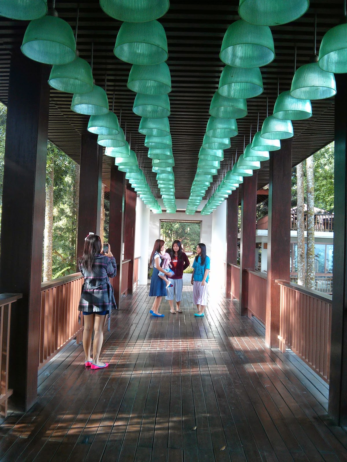 Puas dengan menikmati pemandangan pagi hari dari balkon kamar lantai 3, kita pergi menuju lantai 6 untuk breakfast di The Grand Hill Bistro Cafe. Jalan menuju ke  The Grand Hill Bistro Cafe tersebut harus melewati sebuah jembatan dimana mata kita dimanjakan kembali oleh pemandangan hijau yang sangat teduh, tenang dan indah.